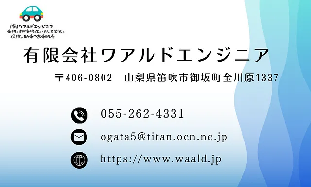 また車両販売、板金塗装、タイヤ販売、フォークリフトなど産業機器のメンテナンス、保険代理業を行い、幅広くお客様のご要望にワンストップにて対応しております。有限会社ワアルドエンジニアは、これまで培ってきた技術に加え、より一層の付加価値を創造・ご提案し、地域のお客様の支えとなる信頼を構築し共に社会に貢献していける会社を目指して努力してまいります。