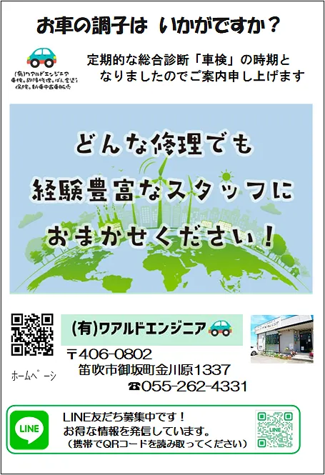 笛吹市 車検後のアフターフォローも充実(笛吹市) ワアルドエンジニア