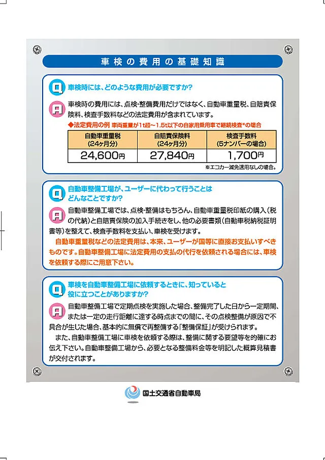 ②自賠責保険料: すべての車に加入が義務付けられている保険。通常、次回車検までの24ヶ月分を前払いします。